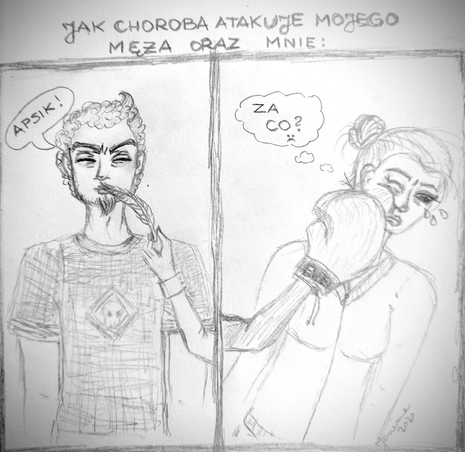 Mężu natomiast zaczyna chrząkać, potem kaszleć i kichać.. I przez jeden dzień siedzi przy kompie pod kocykiem, a ukochana żona (😉) raz na jakiś czas przynosi mu ciepłą herbatkę z cukrem. A następnego dnia trochę jeszcze pociąga nosem, ale już może nawet iść do pracy i w miarę normalnie funkcjonować.